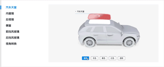 所以我們直接做了一個(gè)汽車(chē)模型,訪(fǎng)客可以通過(guò)左邊的導(dǎo)航知道這個(gè)黑技術(shù)產(chǎn)品可以應(yīng)用到汽車(chē)的哪些部位,然后通過(guò)下面的按鈕實(shí)現(xiàn)汽車(chē)玻璃不同光線(xiàn)和顏色的變化。